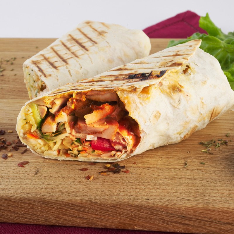 Лаваш, мясо свиное, пекинская капуста, жаренный лук, свежий огурец, помидор, соус барбекю, соус чесночный