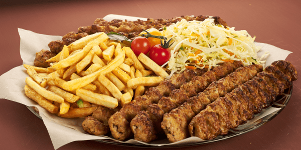 Люля-кебаб из курицы (500 г) Люля-кебаб из свинины (500 г) Картофель фри (700 г) Салат «Витаминный» (300 г) Лепешка тандырная или лаваш (580 г) Соус томатный, соус чесночный, лук (385 г)