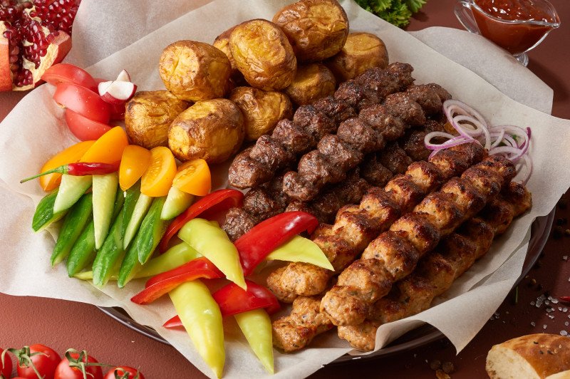 Люля-кебаб из говядины (750 г) Люля-кебаб из свинины (750 г) Картофель запеченный (700 г) Овощное ассорти (600 г) Лаваш или лепешки (480 г) Соус томатный (185г), соус чесночный (185г), лук (100 г)